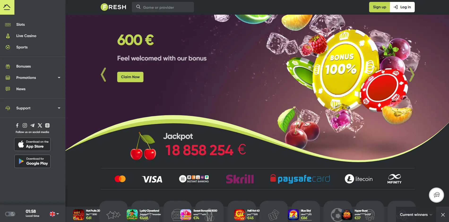O Fresh B.V. é uma subsidiária da renomada empresa internacional Fresh, oferecendo um catálogo de mais de 8.000 jogos. Diferente de outros cassinos, ele também conta com seu próprio estúdio de desenvolvimento, Fresh Games Studio, garantindo jogos exclusivos.